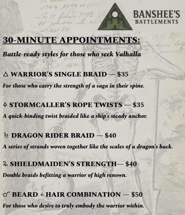Banshee's Battle Braids menu includes multiple types of styles to suit any willing warrior!See our pricing, offerings, and prep guide at your fingertips for easy viewing!