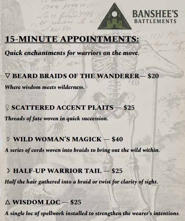 Consult with Banshee to create your one-of-a-kind Battlement or Battle Braid design, enchanted to your specifications!